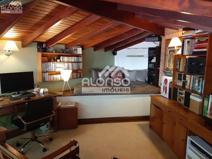 - sótão funcional com móveis planejados para escritório ou home theater